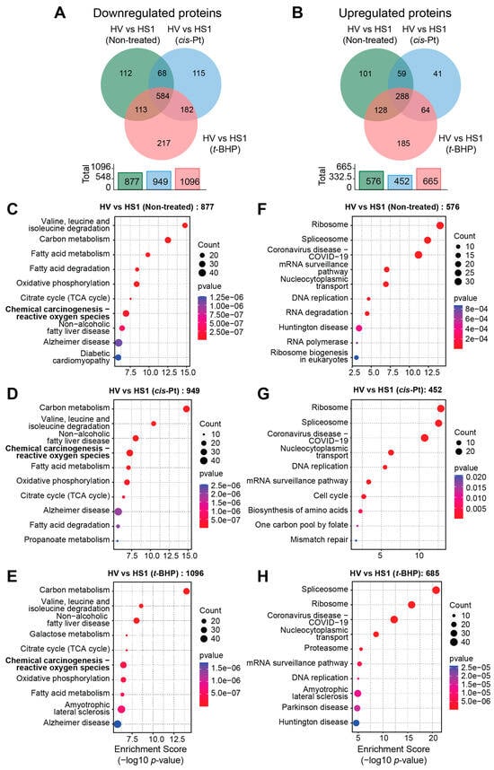 Next, we compared the proteins modulated by SOCS1 in hepatoma cells after segregating them into downregulated or upregulated proteins. Proteins downregulated by SOCS1 were more numerous than upregulated proteins in untreated as well as in cisplatin- or t-BHP-treated cells (Figure 9A,B). Within the downregulated and upregulated proteins, more than half of the proteins were shared by all three groups (584 and 288, respectively; Figure 9A,B), reflecting the trend with total modulated proteins (Figure 8A). Similarly, a significant number of downregulated and upregulated proteins were shared between untreated and cisplatin- or t-BHP-treated cells, and cisplatin-treated and t-BHP-treated cells (Figure 9A,B). The pathway analysis of proteins significantly downregulated or upregulated by SOCS1 revealed that the ‘chemical carcinogenesis–reactive oxygen species’ and ‘carbon metabolism’ pathway proteins were downregulated (Figure 9C–E), whereas the ‘ribosome’ proteins were upregulated (Figure 9F–H) in untreated as well as in cisplatin- or t-BHP-treated cells. These results indicated that SOCS1 reduces the expression of proteins involved in oxidative stress response, thereby reducing the ability of Hepa-SOCS1 cells to tolerate oxidative stress.