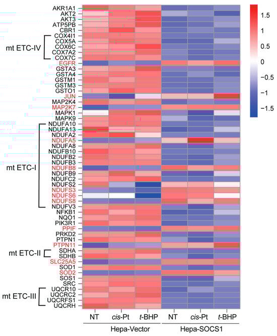 Heatmap analysis of the ‘chemical carcinogenesis–reactive oxygen species’ pathway proteins modulated by SOCS1. All proteins of the ‘chemical carcinogenesis–reactive oxygen species’ pathway modulated in untreated, cisplatin-treated and t-BHP-treated Hepa-SOCS1 cells compared to Hepa-Vector controls were pooled and their signal intensities are plotted in a heatmap. Proteins that are upregulated in Hepa-SOCS1 cells are identified in red colored font. Members of the mitochondrial ETC complexes are indicated.