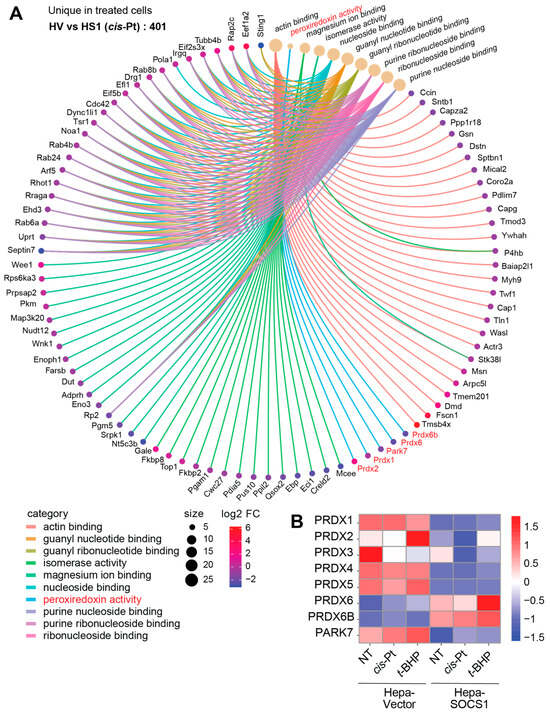 Modulation of peroxiredoxins by SOCS1. Proteins that were enriched in cisplatin-treated Hepa-SOCS1 cells compared to Hepa-Vector controls were analyzed by CNET plot (A). Peroxiredoxin pathway proteins are indicated in red color. (B) Signal intensities of the modulated peroxiredoxin family proteins in untreated, cisplatin-treated and t-BHP-treated Hepa-Vector and Hepa-SOCS1 cells arecompared by heatmap analysis.