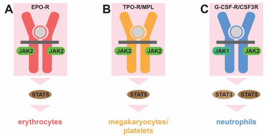 - Pasquier, F.; Marty, C.; Balligand, T.; Verdier, F.; Grosjean, S.; Gryshkova, V.; Raslova, H.; Constantinescu, S.N.; Casadevall, N.; Vainchenker, W.; et al. New pathogenic mechanisms induced by germline erythropoietin receptor mutations in primary erythrocytosis. Haematologica 2018, 103, 575–586. [Google Scholar] [CrossRef]