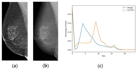 Histogram comparison of mammographic images from different vendors. (a) An image from Hologic. (b) An image from Fuji Film. (c) Histogram comparison of these two images.
