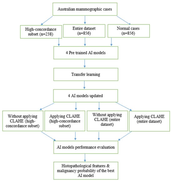 Therefore, we applied the Contrast Limited Adaptive Histogram Equalization (CLAHE) algorithm [23] to enhance the contrast of mammographic cases and evaluated its impact on the performance of AI models. The receiver operating characteristic curve (ROC) and the area under the ROC curve (AUC) metrics were used to evaluate the performance of the four AI models in different scenarios. Histopathological features were analysed with the malignancy probabilities of mammographic cases to provide the best AI model in terms of AUC values. Our method consisted of several steps, as illustrated in Figure 2.
