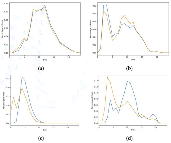 After ethics approval from the University of Sydney, we used screening mammograms collected from the Australian mammographic database Lifepool to assess the performance of the four AI models. The Lifepool database consists of 1712 mammographic cases (856 normal cases and 856 malignant cases). Each malignant case was confirmed by the reports of follow-up biopsies. Each case had four mammographic views: right MLO, left MLO, right CC and left CC views. Mammograms were acquired from mammography machines manufactured by five different vendors, including Fuji Film (32% of cases), Konica (4% of cases), Siemens (34% of cases), Hologic (19%) and Sectra (11% of cases). Each case was annotated by two radiologists and recorded as box regions on the mammographic images. Figure 3 shows an example of the annotations of two radiologists on a mammographic case, with red boxes from Radiologist A and green boxes from Radiologist B. Concordance levels were constructed by analysing Lin’s concordance correlation coefficient (CCC) [24] between the annotations of two radiologists on mammograms according to McBride’s interpretation guide [25]. Lin’s CCC was computed based on the corners of two overlapped boxes of annotations on the same mammographic image. The Intersection over Union [26] metric was used to determine whether two boxes overlapped or not, with a value greater than 0 indicating the overlapping of two boxes. Mammographic images were classified as four concordance levels: ‘almost perfect’ at >0.99 (238 cases), ‘substantial’ at <0.95 to 0.95 (222 cases), ‘moderate’ at 0.95 to 0.90 (202 cases) and ‘poor’ at <0.90 (194 cases). Figure 4 shows the histograms of annotations from the two radiologists in four concordance levels. A correlation metric [27] was used to compare the two histograms. The correlation metric is in the range [0, 1]. A larger correlation value indicates more overlap between the two histograms. For the almost perfect, substantial, moderate and poor levels in Figure 4a–d, the correlation value was 0.996, 0.962, 0.811 and 0.480, respectively. A larger correlation value with the higher concordance level indicated that the thresholds were suitable for different concordance levels.