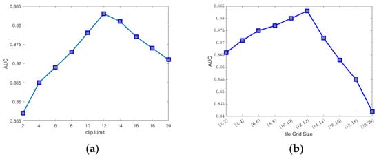 AUC values of the GMIC on Lifepool versus different values of the clip limit and tile grid size. (a) The tile grid size = (8, 8). (b) The clip limit = 12.