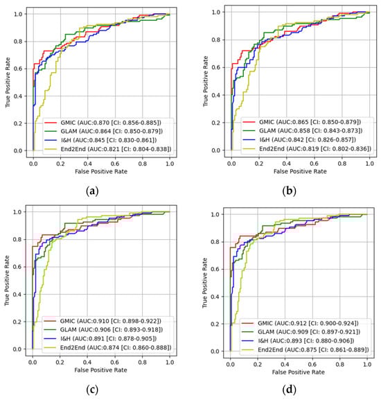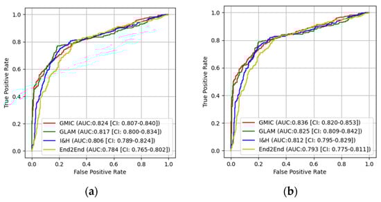 The transfer learning of each AI model was optimized using the Adam algorithm [32]. The loss function used the binary cross-entropy. As suggested in the original studies, the learning rates for the GMIC, GLAM and I&H were set as 10−5 and End2End was set as 10−4, respectively. For an equitable comparison of performance between transfer learning models and pretrained models, the transfer learning approach employed the ResNet-22 network for the global module and the ResNet-34 network for the local module. These are the same networks utilized by the pretrained GMIC and GLAM models. Additionally, I&H utilized the ResNet-22 network as its pretrained model, while End2End employed the VGG network as its pretrained model.
