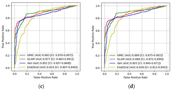 Figure 6 and Figure 7 also illustrate that the receiver operating characteristic (ROC) curves of the four AI models, both with and without transfer learning and with and without contrast enhancement, exhibited superior performance in terms of the Youden index (e.g., 0.650 for GMIC + CLAHE vs. 0.641 for GMIC only in Figure 6a without transfer learning, 0.770 for GMIC + CLAHE vs. 0.761 for GMIC only in Figure 6d with transfer learning) in the high-concordance subset compared to the entire dataset (e.g., 0.548 for GMIC + CLAHE vs. 0.520 for GMIC only in Figure 7a without transfer learning, 0.698 for GMIC + CLAHE vs. 0.678 for GMIC only in Figure 7d with transfer learning). The ROC curves of the four AI transfer learning models showed more improvement on two datasets than those of the four pretrained AI models (e.g., Figure 6a and Figure 7a vs. Figure 6c and Figure 7c).