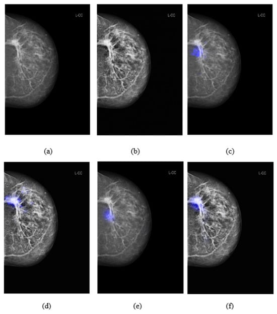 Figure 8 shows the comparison of saliency maps generated from GLAM and GMIC on both an original mammographic image and with the applied CLAHE algorithm. The annotations of two radiologists on the same mammographic case are shown in the left CC view in Figure 3. From Figure 8, we can see that the saliency maps of GLAM (see Figure 8c) and GMIC (see Figure 8e) from original mammographic images deviated from the centroid of the radiologists’ annotations and occupied a smaller area of the annotations. However, the saliency maps of the two AI models from the contrast-enhanced image (see Figure 8d,f) aligned with the centroid of radiologists’ annotations and occupied a larger area of the annotations.