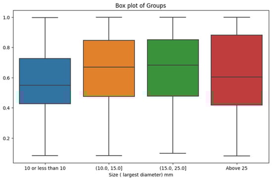 However, when investigating the impact of tumour size categories on malignancy probability, the results were statistically significant. There were 337 cases with tumour size in (0, 10.0 mm], 174 cases in (10.0, 15.0 mm], 179 cases in (15.0, 25.0 mm] and 166 cases above 25 mm. The analysis yielded a p-value of 0.0002, indicating that the distinct size groups indeed manifested significant differences in malignancy probability provided by the AI model. As shown in Figure 9, the most prominent difference was observed between the first size category (i.e., lesions with a size of 10 mm or less) with the lowest malignancy probability scores compared with the other size intervals.