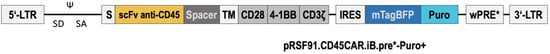 Vector cloning was performed using established recombinant-DNA techniques, essentially as described [16]. The general structure of the CAR expression construct is shown in Figure 1 and largely follows previous work [17]. The used third-generation CAR contained the following elements: An anti-CD45 single-chain variable fragment (scFv) derived from the mouse anti-human CD45 antibody clone BC8 [18], spacer and CD28-derived transmembrane (TM) regions, and tandem CD28 and 4-1BB co-activation domains linked to the CD3ζ signaling domain. Two different spacer variants were used, a short CD28-derived spacer and a longer one derived from IgG4, including its hinge, CH2 and CH3 domain. DNA sequences were codon-optimized. The CAR was cloned into the γ-retroviral vector pRSF91.iB.pre*-Puro+ upstream of an encephalomyocarditis virus (EMCV) internal ribosomal entry site (IRES) and the coding region for the blue fluorescent protein mTagBFP, linked to the puromycin resistance PAC by a 2A peptide. After integration in the host cell genome, the CAR is expressed under control of the SFFV promoter.