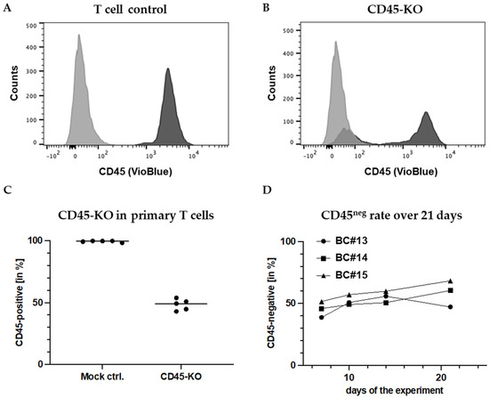 Based on preliminary studies in T and NK cell lines, we chose the sgRNA indicated in the Section 2 to knockout CD45 in primary T cells. Surprisingly, CD45-KO worked far more efficiently in primary cells than in cell lines. FC measurements after 7 days reproducibly demonstrated high KO efficiencies with an average rate of CD45-negative (CD45ko) cells of 51.7% (± 4.5%) (Figure 2A–C). Unexpectedly, the CD45ko T cells had no growth disadvantage in culture, which resulted in stable CD45ko fractions despite the presence of competing CD45pos cells, as shown for cells from three different donors (buffy coats (BC) #13-#15) for 17 days after the KO (Figure 2D). In conclusion, we established an efficient method to knockout the CD45-protein in primary T cells. Along the way, we established CD45-negative PM-1 and CD45-negative KHYG-1 cell lines. Remarkably, we did not observe any impact of CD45-KO on the growth of the cell lines nor the primary T cells in vitro.