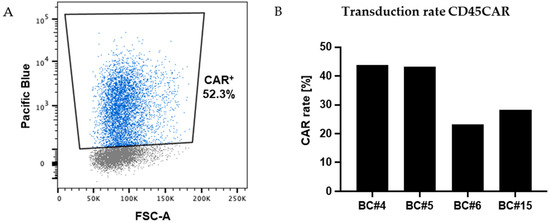 Next, we aimed to establish a combined process for CD45-CAR transduction and CD45-KO in primary T cells. First, we transduced primary human T lymphocytes with the GALVenv-pseudotyped lentiviral CD45-CAR vector (CD45CAR_CD28c_GALV), depicted in Figure 1, following our standard protocol. In independent experiments using buffy coats from four different donors, we observed efficient transduction of 23.1–43.8% CD3 T cells. In these experiments, the gene transfer rates were determined based on BFP expression as measured on days 5–8 after transduction (Figure 3).