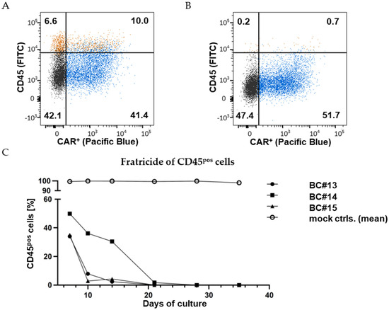 Contrary to the expectation, we found CD45ko/CD45CAR+ cells to mediate efficient fratricide killing of CD45pos T cells as exemplified for BC#4 in Figure 4A,B. As shown in Figure 4A, using protocol P1, we obtained 41.4% CD45ko/CD45CAR+ cells (Q3 of the dot plot) three days after RNP electroporation; at this time point approx. one of six T cells (16.6%) were still CD45hi (Q1 + Q2). Only 48 h later almost no CD45-positive cells were left (0.9%, Figure 4B, (Q1 + Q2)).