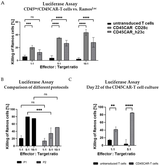 Efficient killing of Ramos B cells by CD45ko/CD45CAR-T cells within 4 h. (A) CD45ko/CD45CAR-T cells are functional with both the long and the short spacers. Transduction and electroporation of T cells from BC#4 were performed following protocol P1. The 4 h killing assays (n = 3) were carried out on day 10 of the experiment. (B) Comparison of killing activities of CD45ko/CD45CAR-T cells produced with the two different protocols P1 and P2. T cells were from BC#6, the killing assays (n = 1–3) were carried out on day 12 after T-cell activation. Only the short spacer was used in this experiment. (C) High killing activity of CD45ko/CD45CAR T cells after prolonged in vitro culture. CAR-T cells were produced following protocol P2 using BC#5. The killing assays (n = 2–3) were performed on culture day 22. Levels of significance are designated as follows: ** p < 0.01, *** p < 0.001, and **** p < 0.0001, ns = not significant.