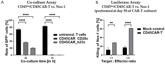 In the killing experiments, we tested CD45-CAR constructs with two different spacers differing in their lengths, namely CD45CAR_CD28c (CD28 derived) and CD45CAR_h23c (derived from human IgG4 CH2-CH3 domains, modified for reduced Fc receptor binding [24]). Both CD45CAR constructs facilitated efficient T-cell transduction and killing of Ramos cells, whereby the CAR construct with the shorter spacer (CD28c) was more effective in this setting. In fact, for CD45CAR_CD28c, we observed killing rates of up to 43.7% at an effector–target (E:T) ratio of 10:1 after just 4 h of co-incubation (Figure 5A).