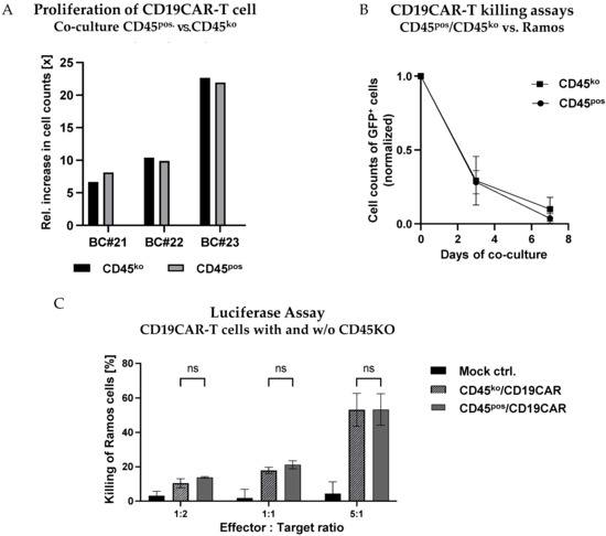 Lastly, we asked whether prolonged in vitro cultivation might impair the functional activity of CD45ko/CD45CAR-T. To address this question, the luciferase-based killing assay was performed on day 22 of ex vivo culture (Figure 5C). Notably, the killing of Ramos cells at that late time point was at least as efficient as 10 days earlier (compare Figure 5B). The conserved or even increased functional activity of those cultured CD45ko/CD45CAR-T cells might be due to the higher purity after completion of fratricide (compare Figure 4C).