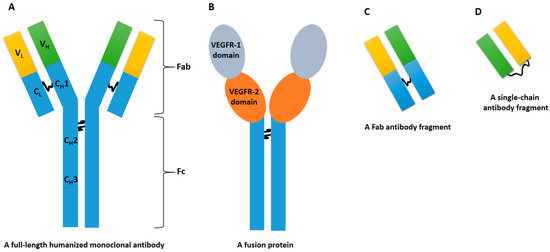 Anti-VEGF-based drugs play crucial roles in the treatment of ocular and oncological pathologies by targeting VEGF and modulating angiogenesis. Their distinct molecular characteristics, pharmacokinetics, and mechanisms of action enable them to address a range of medical conditions with varying efficacies and safety profiles. The most used are bevacizumab, ramucirumab, aflibercept, brolucizumab, and ranibizumab (Figure 1).