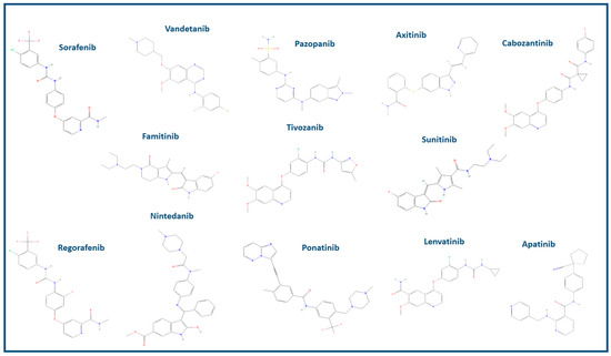 Sunitinib, with a MW of approximately 398 daltons (Da), has received FDA approval for its application in the field of oncology, specifically for the treatment of renal cell carcinoma, gastrointestinal stromal tumors (GISTs), and pancreatic neuroendocrine tumors (PNET). Notably, Sunitinib has been found to inhibit multiple kinases, including VEGFR-1, VEGFR-2, VEGFR-3, c-KIT, FLT3 kinase, colony-stimulating factor 1 receptor, and RET kinase [38]. Sorafenib, with a MW of roughly 464 Da, is predominantly employed in the treatment of advanced renal cell carcinoma and hepatocellular carcinoma. It is a tyrosine kinase inhibitor that primarily targets Raf kinase and VEGFR-2. It also exhibits activity against several other kinases, including VEGFR-1, VEGFR-3, PDGFR-beta, Flt-3, and c-KIT [39]. Vandetanib, with a MW of approximately 474 Da, has received FDA approval for the treatment of medullary thyroid cancer. It inhibits VEGFR-2, VEGFR-3, and EGFR [40]. Pazopanib (MW: 437 Da) is used in the treatment of advanced renal cell carcinoma and soft tissue sarcoma. Pazopanib inhibits kinases such as VEGFR-1, VEGFR-2, VEGFR-3, c-KIT, and PDGFR [41,42]. Axitinib, with a MW of roughly 386 Da, is primarily indicated for the treatment of advanced renal cell carcinoma. It primarily inhibits VEGFR-1, VEGFR-2, and VEGFR-3 [43]. Cabozantinib, with a MW of approximately 501.63 Da, is applied in the treatment of advanced renal cell carcinoma, hepatocellular carcinoma, and medullary thyroid cancer. It inhibits VEGFR-2, c-MET, and AXL [44]. Regorafenib (MW of approximately 482 Da) is indicated for the treatment of colorectal cancer, gastrointestinal stromal tumors (GISTs), and hepatocellular carcinoma. Regorafenib inhibits a range of kinases, including VEGFR-1, VEGFR-2, VEGFR-3, c-KIT, RET, RAF-1, and BRAF [45,46,47]. Nintedanib, classified as a triple angiokinase inhibitor, boasts a MW of around 539 Da. It primarily inhibits kinases like VEGFR, FGFR, and PDGFR. While it primarily serves in the treatment of idiopathic pulmonary fibrosis, the FDA has endorsed its use in non-small cell lung cancer in oncological contexts [48,49]. Ponatinib, with a MW of approximately 569 Da, is primarily used for the treatment of chronic myeloid leukemia (CML). It is a potent tyrosine kinase inhibitor that targets a range of kinases, including BCR-ABL, which is associated with CML, as well as kinases such as VEGFR-2, SRC, KIT, and PDGFR [50]. Lenvatinib, characterized by an MW of approximately 426.88 Da, is a tyrosine kinase inhibitor applied in the treatment of differentiated thyroid cancer and hepatocellular carcinoma, with FDA approval for these specific oncological indications. Lenvatinib inhibits VEGFR-1, VEGFR-2, VEGFR-3, FGFR, RET, and KIT kinases [51,52]. Tivozanib, with an MW of roughly 454 Da, recently received FDA approval for the treatment of advanced renal cell carcinoma. It primarily inhibits VEGFR-1, VEGFR-2, and VEGFR-3 [53]. Famitinib is an innovative and powerful multi-targeted TKI that primarily targets VEGFR-2. However, it also exhibits low affinity for PDGFR and c-kit-associated kinases. Currently, it is the subject of clinical trials for cancer treatment, including renal cell carcinoma. Its MW is approximately 419 Da [54]. Apatinib is undergoing investigation for the treatment of advanced gastric cancer and various other malignancies. It is a highly selective inhibitor of VEGFR-2, with a MW of about 494 Da [55,56].