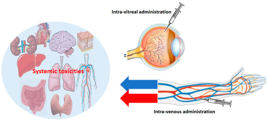Intra-vitreal administration involves the direct injection of a substance into the vitreous humor of the eye. This route is commonly employed for the targeted delivery of VEGFi to treat ocular diseases, allowing for a concentrated and sustained release of the agent within the eye. Intra-venous administration entails the injection of the drug directly into a vein, typically entering the bloodstream, facilitating systemic drug delivery. The size of the red and blue arrows is directly and intuitively proportional to the “systemic” side effects on other organs. Systemic effects are evidently more frequent and intense when the VEGFi is administered systemically. The systemic diffusion of the drug is negligible when administered intra-vitreally (see the manuscript text for further details).