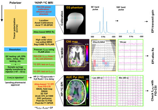 - Li, Y.; Vigneron, D.B.; Xu, D. Current human brain applications and challenges of dynamic hyperpolarized carbon-13 labeled pyruvate MR metabolic imaging. Eur. J. Nucl. Med. Mol. Imaging 2021, 48, 4225–4235. [Google Scholar] [CrossRef]