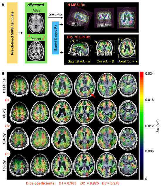 Because the conventional assessment of treatment response in patients with gliomas remains challenging, there has been greater attention placed on the role of metabolic imaging within the precision medicine framework. The atlas-based HP-13C EPI implemented here offers a clear methodological approach to mapping longitudinal changes in dynamic Warburg-related metabolism, with the goal of identifying early predictors of therapeutic response. More recent multi-resolution adaptations of the EPI sequence [33,34,35] can assist this longitudinal analysis by independently tailoring the spatial resolution of each metabolite, so as to increase the granularity of detection and improve the localization of vascular signals that confounds kinetic modeling. Within our proposed multi-parametric imaging protocol, lactate-edited 1H MRSI provides a complementary measure of steady-state metabolism while leveraging the same atlas-based prescription as HP-13C EPI for cross-data comparison in the same orientation. As this study was concerned with the comparability of dynamic and steady-state metabolism, the atlas prescription was constrained by the coverage limitations of 1H MRSI, primarily related to the magnetic susceptibility [36] of the sinuses and unwanted lipid signal from around the eyes. We anticipate that future studies can integrate more commercially available techniques for the stand-alone prescription of HP-13C imaging.