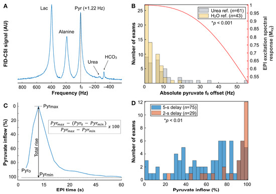 HP-13C EPI methodologies. Example non-selective FID-CSI spectra following EPI that display the foffset,Pyr; alanine is extra-parenchymal (A). Histogram of the |foffset,Pyr| obtained using a coil-embedded [13C]-urea phantom versus water reference is shown alongside the corresponding EPI excitation spectral response that indicates relative signal loss due to off-resonance; the maximum foffset,Pyr resulting from the water reference technique still retained ~0.96 Mxy (B). Definition of pyruvate inflow for NAWM (C) and histogram of pyruvate inflow percentages captured by 5 s versus 2 s EPI acquisition delays after tracer injection and saline flush (D). *, statistically significant difference.