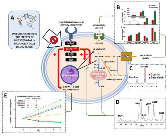 Schematic representation of the melanoma research. The mutated BRAF protein (BRAFV600E; red rectangle) has positive effects on growth and cell proliferation as well as on glycolysis (red arrows with positive sign) while its effect on the complete pyruvate oxidation by the mitochondria is negative (red arrow with negative sign). In contrast, dabrafenib (A; ball-and-stick model from [40]) inhibits the effects of the mutated BRAF protein, reducing growth and cell proliferation while controlling the Warburg effect (large white block arrow with the prohibition sign). The orange arrows highlight the enhanced metabolic effects of BRAFV600E, while blue arrows represent its inhibitory metabolic effects. The green arrows underscore representative examples of our results measuring extracellular glucose and lactate values (B; see Figure 4 for full explanation of the panel), intracellular lactate and alanine values using noninvasive 1H MRS (C; see Figures 2 and 5), bioenergetic-related metabolites also measured noninvasively by 31P MRS (D; see Figure 6), and tumor growth (E; see Figure 7 and Table 2), In this study, we assessed the values of these parameters in four models of human melanoma with diverse responses to dabrafenib (WM3918 < WM9838BR < WM983B < DB-1). We aimed to determine the metabolic effects of dabrafenib in melanoma and their correlation with response.