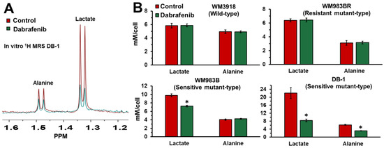 (A) Representative high-resolution 1H MRS spectra of alanine and lactate in the DB-1 cell line. The spectrum of control cells is in red, and the spectrum of dabrafenib-treated cells is in green. (B) Intracellular lactate and alanine concentrations in mM/cell measured by 1H MRS in isolated human melanoma cells. An equal number of cells (1.5 × 107 cells) was used for each analysis. The asterisk (*) represents a statistically significant difference (σ = 0.05) between control (n = 3) and treated (n = 3) groups.