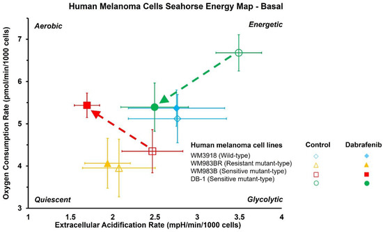 Dabrafenib’s effect on Oxygen Consumption Rate (OCR) vs. Extracellular Acidification Rate (ECAR) in melanoma cell lines under basal conditions. Untreated (open symbols) and dabrafenib-treated cells (solid symbols; n = 24 per group) are shown. The dashed lines indicate significant shifts in the cell energy phenotype between control and dabrafenib treatment (see Table 1).