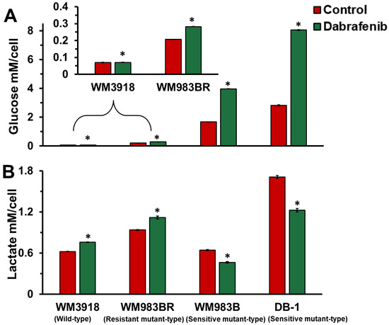 Measurement of the extracellular flux of (A) glucose and (B) lactate in wild-type (WM3918), resistant mutant-type (WM983BR), and sensitive mutant-type (WM983B, and DB-1) melanoma cells incubated in the untreated (control; red columns) or treated (dabrafenib [25 nmol/L]; green columns) at 48 h. The inset in (A) expands 20 times the data for WM3918 and WM983BR. Error bars represent the SEM. An asterisk (*) represents a statistically significant difference (σ = 0.05) between the control (n = 3) and dabrafenib-treated (n = 3) groups.