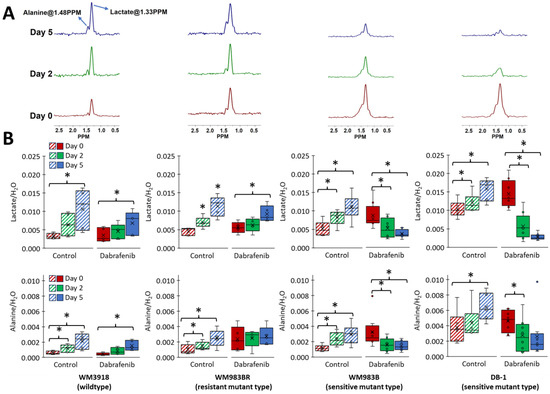 (A) Representative 1H MRS with Hadamard-selective, multiple quantum coherence (HDMD-SelMQC) transfer pulse sequence to measure lactate and alanine at Day 0 (red), Day 2 (green), and Day 5 (blue) after treatment with dabrafenib in each human melanoma xenografts model. (B) Box-and-whisker plots of lactate and alanine normalized by the water content in the same volume (i.e., lactate/H2O and alanine/H2O) were determined from the 1H MRS spectra depicted in (A) in control (striped bars) and dabrafenib-treated groups (solid bars). The asterisk (*) represents a statistically significant difference (σ = 0.05).