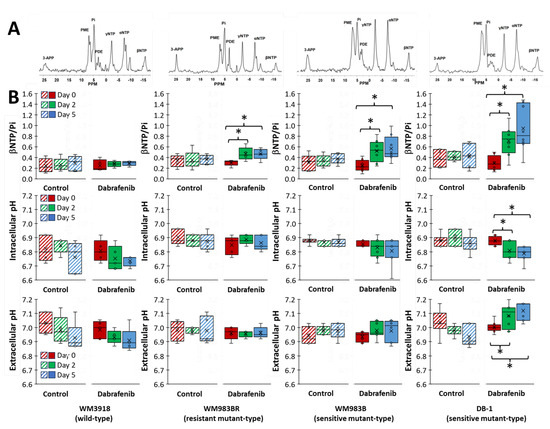 The 31P spectrum of the tumor models consists of well-resolved low-field resonances, including the three phosphate moieties of NTP and Pi. Given that the NTP signals predominantly originate from ATP, that there is a rapid exchange of the terminal phosphates of the NTPs, and that the βNTP signal does not have other overlapping signals nearby, we considered that the βNTP/Pi ratio represents most accurately the in vivo bioenergetic state of the tumors. Furthermore, utilizing the 31P MRS chemical shift differences between Pi and αNTP and 3-APP and αNTP, we measured pHi and pHe, respectively. The externally added 3-APP has varied signal intensities because its dose was not adjusted for variations in animal weight. Moreover, since this was a bolus administration, signal intensities may have varied due to clearance rate differences in individual animals and the duration of the study. Since the critical factor for using this exogenous agent is the signal frequency to determine external pH, as far as there is a measurable signal, its intensity is less critical towards the rigor of quantification of this physiological parameter. Panel A of Figure 6 shows representative noninvasive spectra localized in the tumor of the four xenografts (assignments in the figure caption). Panel B depicts box-and-whisker plots of the values of the ratio βNTP/Pi and intracellular (pHi) and extracellular pH (pHe) assessed from the 31P MRS data as previously described. As shown in the Figure, only the DB-1-sensitive xenograft showed significant changes in pH under dabrafenib treatment. In this xenograft, the intracellular milieu became significantly acidic, while the extracellular milieu became significantly alkaline. Interestingly, dabrafenib increased significantly the βNTP/Pi ratio in the three mutant types regardless of whether they were resistant or sensitive to dabrafenib. These results could be considered paradoxical and should be explored further.
