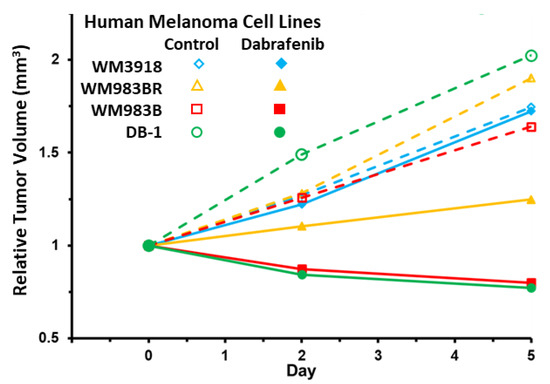 Comparison of the relative tumor volume in the control vs. dabrafenib groups of the human melanoma cell lines.