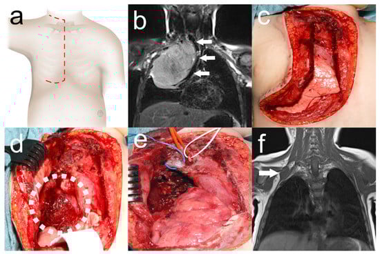 Trap-door thoracotomy for resection of Ewing sarcoma of the cervicothoracic junction. Two-year-old girl who underwent tumor resection by trap-door thoracotomy ((a) red dashed line: surgical incision) with respiratory distress due to Ewing’s sarcoma. Preoperative MRI (b) showing a tumor of the right cervicothoracic junction causing mediastinal shift with compression of the trachea (white arrows). Urgent tumor resection was performed, leaving the mammary gland intact (c). Tumor exposure (white dotted circle) after lifting the osteomuscular flap (d). Surgical site (e) after near-total tumor resection with the right brachiocephalic vein (blue loop), the right brachiocephalic trunk (red loop), and the phrenic nerve (white loop). Tumor remnant adjacent to the second loop (white arrow) on MRI (f) after adjuvant chemotherapy. Secondary complete tumor resection was again performed by trap-door thoracotomy.