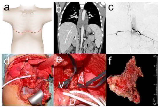 Extended clamshell thoracotomy for resection of thoraco-abdominal neuroblastoma. Five-year-old boy who underwent clamshell thoracotomy ((a) red dashed line: surgical incision) for resection of a thoraco-abdominal neuroblastoma. Preoperative CT (b) showed complete encasement of the aorta. Preoperative spinal angiography (c) showed artery of Adamkiewicz arising from the left aorta at the 12th thoracic vertebral body. Clamshell thoracotomy (d) was extended distally in the midline (L: liver) and the pericardium and diaphragm were incised to expose a retrocardiac tumor as retraction of the heart resulted in bradycardia and hypotension with the need for intermittent CPR. Surgical site (e) with tumor between aorta (A) and superior vena cava (V) with phrenic nerve (white loop) and diaphragm (D) retracted anteriorly. Tumor (f) after gross total resection.