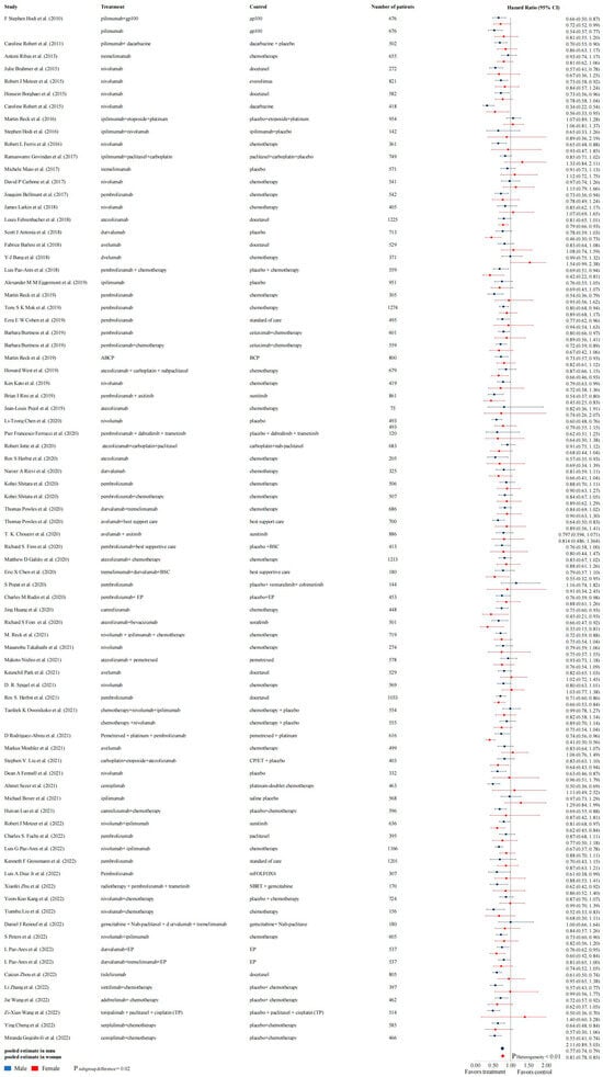 | Zi-Xian Wang et al. (2022) [106] | 3 | Gastrointestinal cancer | >1 | toripalimab + TP vs. placebo + TP | 514 | 437 (85%) | 77 (15%) | NA | NA | PFS | 0.57 (0.45–0.72) | 0.51 (0.40–0.66) | 0.96 (0.53–1.75) |