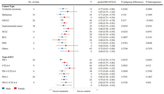 Zhong X, Sun J, Zeng N, Xiong Y, An Y, Wang S, Xia Q. The Effect of Sex on the Therapeutic Efficiency of Immune Checkpoint Inhibitors: A Systematic Review and Meta-Analysis Based on Randomized Controlled Trials. Cancers. 2024; 16(2):382. https://doi.org/10.3390/cancers16020382