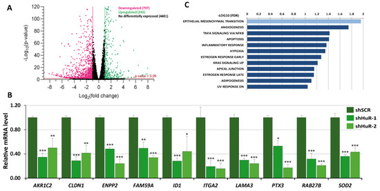 Gene expression profile of Hs578T HuR-silenced cells. (A) Volcano plot displaying changes in the transcriptome of HuR-depleted cells. Genes with a log2 fold change of > 1.0 or < −1.0 and p < 0.05 are shown as pink (downregulated) or green (upregulated) dots, respectively. (B) Validation of downregulation of selected DEGs in Hs578T HuR-ablated cells using quantitative RT-PCR. Data represent the mean ± SEM of three independent experiments with triplicate assays. The p-value was calculated using a two-sided unpaired Student’s t-test (* p < 0.05; ** p < 0.01; *** p < 0.001). (C) GSEA plot of DEGs showing enrichment of Hallmark signatures. The y-axis displays the FDR-values (−Log10 FDR) of the enrichments.