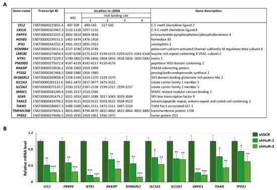 Selection of putative HuR targets in Hs578T cells. (A) DEGs list displaying the location of ARE and overlapping HuR binding sites in the cDNA of the selected DEGs. (B) Validation of downregulation of putative targets in Hs578T HuR-silenced cells using quantitative RT-PCR. Data represent the mean ± SEM of three independent experiments assayed in triplicate. The p-value was calculated using a two-sided unpaired Student’s t-test. (* p < 0.05; ** p < 0.01; *** p < 0.001).