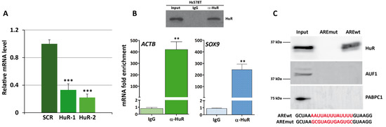 HuR binds to the SOX9 ARE in Hs578T cells. (A) Quantitative RT-PCR confirming downregulation of SOX9 in HuR-silenced cells. Data are the mean ± SEM of three independent experiments assayed in triplicate (*** p < 0.001). (B) RIP analysis of shSCR cells using IgG and anti-HuR antibodies. HuR immunoprecipitation efficiency was tested using Western blot (upper panel). ACTB and SOX9 mRNAs were quantified using RT-qPCR and represented as fold enrichment compared to IgG RIP analysis. Data are the mean ± SEM of three independent experiments assayed in triplicate (** p < 0.01). (C) HuR pull down using biotinylated synthetic RNA corresponding to the wild type SOX9 ARE (AREwt) or a mutated version (AREmut). The presence of HuR, hnRNPD (AUF1), or PABPC1 in the input and pull down fractions was detected using Western blot.