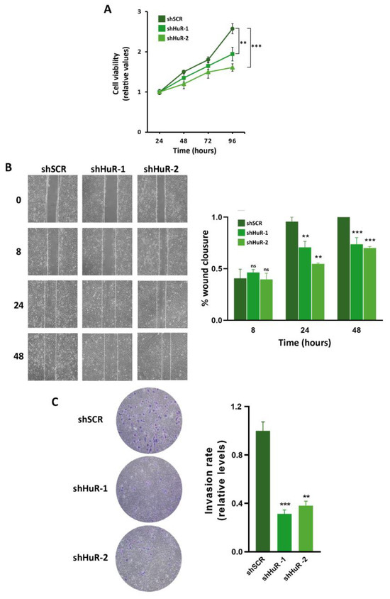 HuR silencing decreases proliferation migration and invasion in Hs578T cells. (A) Cell viability analyses of control (shSCR) or HuR-silenced (shHuR-1, shHuR-2) cells. MTT assays were performed at the indicated time points after seeding. Data were normalized to the value detected at 24 h. Error bars represent the mean ± SEM of three independent experiments assayed in quintuplicate (B) Cell motility of the indicated clones was analyzed using wound-healing assay. Images were taken at 0, 8, 24, and 48 h (h) after culture scratch (upper panel) and area closure was quantified using ImageJ (lower panel). Results represent the mean ± SEM of three independent experiments. (C) Cells were seeded in the upper chambers of Transwell, allowed to migrate for 18 h, membrane stained with crystal violet, and as described in Methods section were photographed. Left panel: representative images of the lower membrane (invading cells). Right panel: percentage of invasiveness by direct measurement with ImageJ. Values represent the mean ± SEM from three independent experiments performed in triplicate. (** p < 0.01, *** p < 0.001; ns, not significant). The images in (B) and (C) were taken using an inverted microscope with the 10× objective.