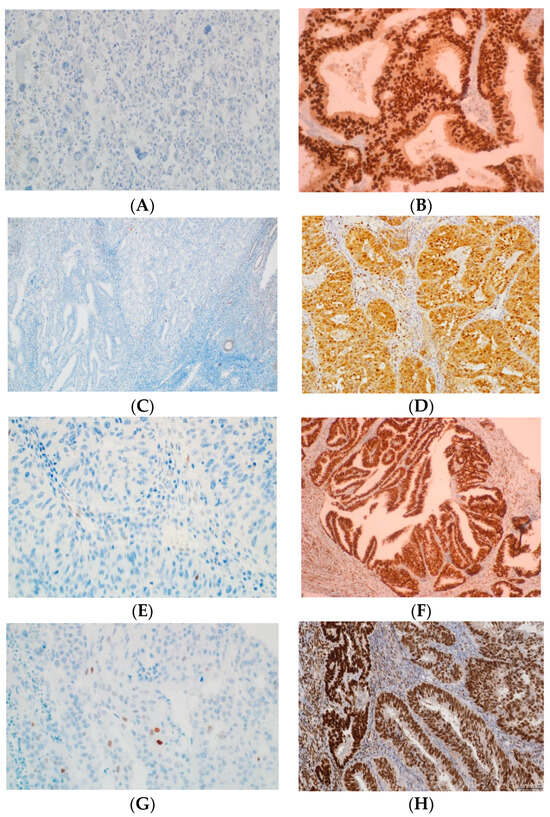 Staining for MMR proteins was performed on all specimens. It was used to stain the 10% FFPE four-micrometer-thick sections according to the manufacturer’s instructions (Agilent Dako, Glostrup, Denmark). Monoclonal antibodies specific to the mismatch repair genes were employed, including Mouse Monoclonal Anti-Human MutL Protein Homolog 1 (MLH1, Clone ES05), Mouse Monoclonal Anti-Human MutS Protein Homolog 2 (MSH2, Clone FE11), Rabbit Monoclonal Anti-Human MutS Protein Homolog 6 (MSH6, Clone EP49), and Rabbit Monoclonal Anti-Human Postmeiotic Segregation Increased 2 (PMS2, Clone EP51). All four proteins were detected in the nucleus. When nuclear staining of any of the four proteins was missing, or MLH1/PMS2 or MSH2/MSH6 were negative, mismatch repair deficiency (MMRd) was suspected. Endometrial cancer that lacked a pathogenic POLE variant but retained MMR protein expression and wild-type p53 IHC was classified as a “no specific molecular profile” (NSMP) variant. Upon observation of a complete loss of nuclear expression of certain MMR proteins (MLH1, MSH2, MSH6, PMS2) in carcinoma cells using IHC, the proteins are considered deficient or absent. Atypical p53 protein expression in carcinoma cells was identified as either intense and widespread nuclear staining or a total absence of staining, termed “null.” Meanwhile, faint and uneven staining was categorized as indicative of wild-type expression. For both MMR and p53 staining, stromal and inflammatory cells served as internal controls. When applicable, samples with few carcinoma cells or completely negative staining of the internal controls were discarded.