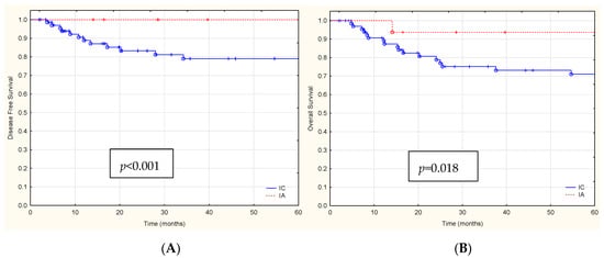 During the 60-month follow-up period, 23 patients died. Table 3 summarizes the univariate and multivariate Cox proportional hazards models for OS. For OS, stage IC, aggressive histological types EC, and the presence of p53abn protein immunoexpression were all significantly associated with lower 5-year OS rates (Figure 2B,D,F).