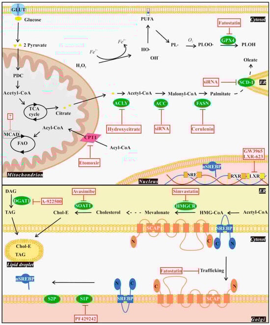 Experimental drug targets of the lipid metabolism pathways in GBM. Drugs affecting lipid metabolism pathways in GBM could target SREBP activation, de novo lipogenesis (DNL), lipid droplet (LD) formation, fatty acid oxidation (FAO), and ferroptosis. SREBP activation requires SREBP-SCAP translocation from ER to Golgi, where it is cleaved by S1P and S2P yielding the N terminal fragment of SREBP, which in turn translocates into the nucleus (nSREBP) and activates lipogenic genes. Fatostatin and PF429242 affect the SREBP pathway by inhibiting SREBP translocation and S1P activity, respectively. SREBP activation leads to DNL by using glycolysis-derived citrate as a precursor. Conversion of cytosolic citrate to fatty acids can be targeted by inhibiting the involved enzymes ACLY, ACC, or FASN by hydroxycitrate, siRNA, or cerulenin, respectively. Similarly, silencing expression of the ER-associated SCD-1 results in DNL inhibition. Simvastatin targets HMGCR and depletes cholesterol, which is crucial for GBM survival. To reduce lipotoxicity, GBM cells accumulate LDs and sequester excess FAs and lipids in the form of cholesteryl esters (Chol-E) or TAGs generated by the enzymes SOAT1 or DGAT1, respectively. LD formation can be targeted by inhibition of SOAT1 or DGAT1 by avasimibe or A-922500, respectively. Inhibition of the energy-producing FAO can be achieved by targeting CPT1 with etomoxir or by depleting MCAD, efficiently reducing GBM cell viability. Upon ferroptosis hydroxyl radicals react with PUFAs in the cell membrane, resulting in the generation of free cytotoxic radicals (PLOO·). GBM cells can escape ferroptosis through GPX4 activity by reducing PLOO·s to PLOH. This step can be blocked by the inhibitor fatostatin. Reducing LDLR expression through LXR elements by synthetic LXR agonists LXR-623 and GW3965 causes cholesterol-dependent GBM cell death. Abbreviations: ACC: acetyl-CoA carboxylase, ACLY: ATP citrate lyase, CPT1/2: carnitine palmitoyl transferase 1/2, DAG: diacylglycerol, DGAT: diacylglycerol acyltransferase, FASN: fatty acid synthase, GPX4: glutathione peroxidase 4, HMGCR: β-hydroxyl-β-methylglutaryl-CoA reductase, LDLR: low-density lipoprotein receptor, LXR: Liver X receptors, MCAD: medium-chain acyl-CoA dehydrogenase, PDC: pyruvate dehydrogenase complex, PL.: phospholipid radical, PLOH: phospholipid alcohol, PLOO.: phospholipid peroxyl radical, PUFA: polyunsaturated fatty acid, RXR: retinoid X receptor, S1P: site-1 protease, S2P: site-2 protease, SCAP: SREBP cleavage activating protein, SCD: stearoyl-CoA desaturase, SOAT: sterol O-acyltransferase, SREBP: sterol regulatory element binding protein, TAG: triacylglycerol, and TCA: tricarboxylic acid cycle.