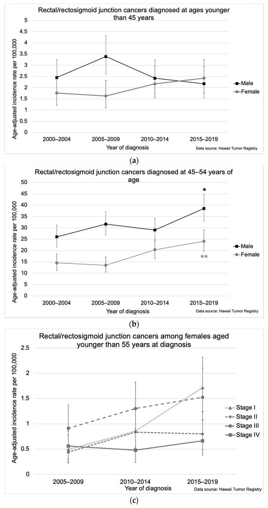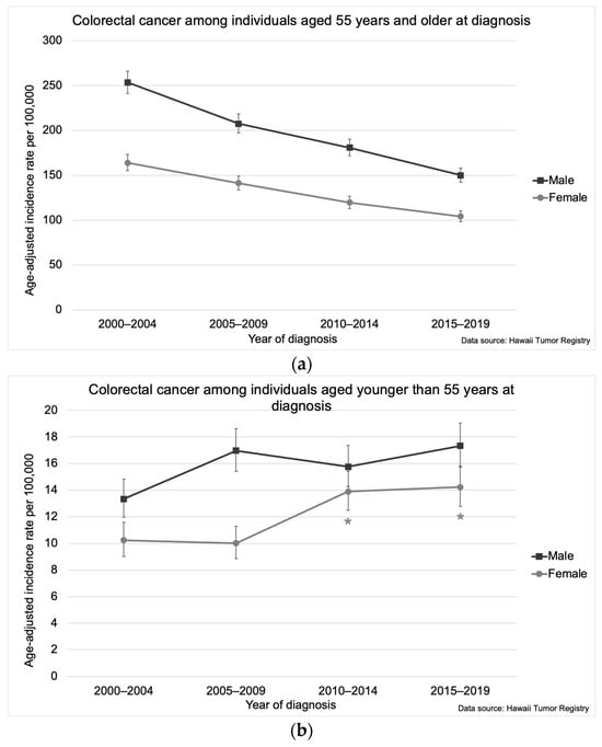 Colorectal cancer incidence in Hawaii from 2000–2019 by gender among individuals aged (a) 55 years and older at diagnosis, (b) younger than 55 years at diagnosis, and (c) 45–54 years at diagnosis. The asterisk (*) indicates a significant difference from 2000–2004 and 2005–2009 incidence rates. Five-year incidence rates per 100,000 were age-adjusted to the 2000 US Standard Population.