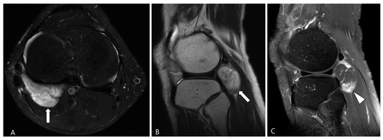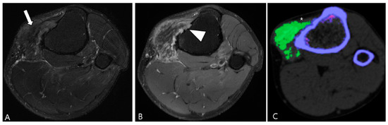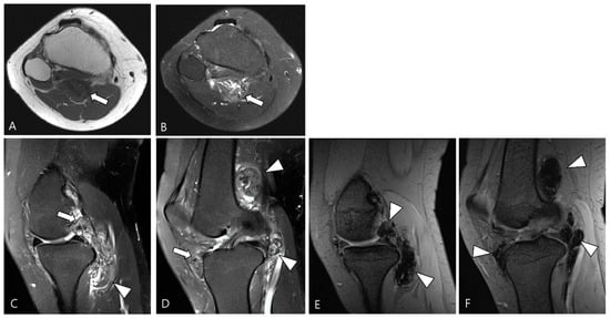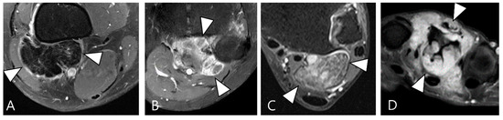 The extra-articular growth of D-TSGCT primarily arises as a result of extra-articular extension of intra-articular D-TSGCT through transcapsular fenestrations (Figure 1 and Figure 3) [31]. However, due to its infiltrative growth pattern, determining the origin is often challenging [32]. Instances of extra-articular D-TSGCT without intra-articular communication are exceedingly rare, and such cases involve the bursa around the knee, such as popliteal bursa (Figure 4) [20,32,33,34,35]. In cases where TSGCTs occur in the digits, they are typically located in extra-articular portion, and it is crucial to differentiate between two subtypes [36]. Jeong et al. [36] conducted a comparison of the MRI morphologic features of TSGCTs in the digits between the diffuse type and localized type. Their findings revealed that D-TSGCTs in digits manifest as multinodular and infiltrative masses without a peripheral capsule. Kim et al. [28] also found that the most sensitive MRI parameter with the highest odds ratio for extra-articular D-TSGCT, which was the lack of peripheral hypointensity (lack of capsule) (Figure 5).