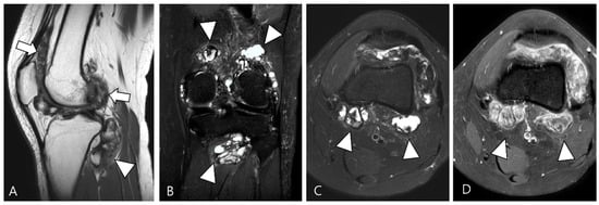 A 27-year-old female with D-TSGCT in the knee. (A) Sagittal T2WI shows diffuse and multinodular synovial thickening with scattered dark SI foci (arrows) in the knee joint space. Extra-articular extension to the popliteus myotendinous junction is noted (arrowhead). (B,C) Coronal and axial fat-suppressed T2WIs show that proliferated synovium engulfs the reactive joint effusion resulting in multichambered cystic mass-like lesions around popliteal fossa (arrowheads). (D) Axial contrast-enhanced T1WI reveals thickened synovium as diffuse septal enhancement within the cystic changes (arrowheads).