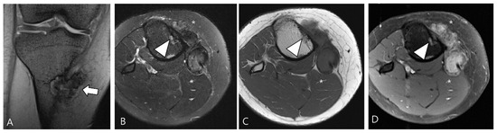 - Kim, S.J.; Kang, Y.-K.; Yoo, C.Y.; Kim, J.Y. Tenosynovial Giant Cell Tumor of the Pes Anserine Bursa with Bone Marrow Extension into the Tibia: A Case Report. J. Korean Soc. Radiol. 2016, 75, 322–326. [Google Scholar] [CrossRef]