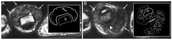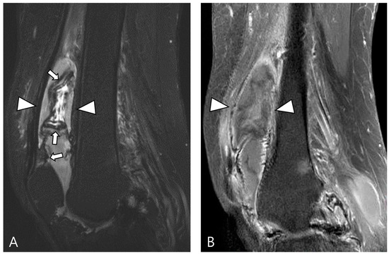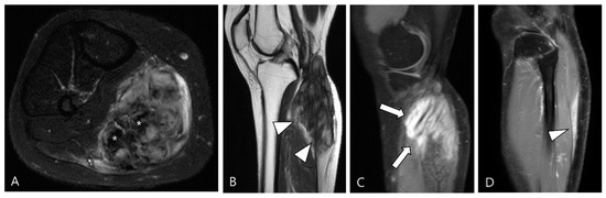 DF is a locally aggressive (myo)fibroblastic neoplasm that originates in deep soft tissues, characterized by infiltrative growth and a propensity for local recurrence without metastatic potential [63,64]. Aggressive fibromatosis, musculoaponeurotic fibromatosis, and desmoid tumor are synonymous term for DF [63]. The major subgroups include superficial (palmar and plantar) and deep fibromatoses. The deep fibromatoses are further classified as extra-abdominal (found in the upper extremities, lower extremities, trunk, head and neck), abdominal wall (arising from musculoaponeurotic structures of the abdominal wall), and intra-abdominal (in the mesentery or pelvis) [63,65]. Extra-abdominal DF originates from the connective tissue of muscle and their overlying aponeurosis or fascia, potentially infiltrating adjacent subcutaneous tissue and muscle [65]. DF exhibits a heterogeneous appearance on MRI, with variable SI on T2WI and T1WI due to diverse intralesional components, including myxoid matrix, cellular stroma, and fibrous tissue/collagen bands [66,67]. Decreased T2 SI corresponds to dense collagen and hypocellularity, while increased T2 SI correlates with high cellularity [66]. TSGCT and extra-abdominal DF exhibit similar SI on MRI, but DF manifests along the fascial planes, with or without muscle invasion. Recognizing the characteristic signs of extra-abdominal DF aids in distinguishing between the two diseases (Figure 16); DF displays the staghorn sign (fingerlike tumor extension into muscle or subcutaneous fat) and fascial tail sign [68].