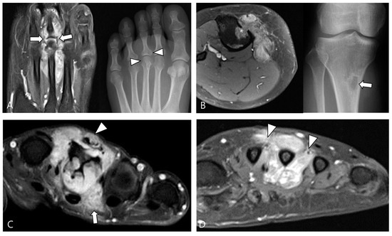 - Llauger, J.; Palmer, J.; Rosón, N.; Bagué, S.; Camins, A.; Cremades, R. Nonseptic monoarthritis: Imaging features with clinical and histopathologic correlation. Radiographics 2000, 20, S263–S278. [Google Scholar] [CrossRef]
