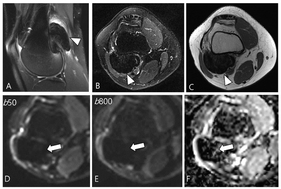 A 29-year-old female with D-TSGCT in the distal femur. (A,B) Sagittal and axial fat-suppressed T2WIs show a low SI mass at the popliteal fossa (arrowheads). (C) Axial T1WI also shows low SI due to extensive hemosiderin deposition (arrowhead). (D,E) The mass shows low SI on low and high b-value images of DWI due to hemosiderin deposition (arrows). (F) The mass creates a pseudo-low ADC value on the ADC map (arrow), suggesting T2 black-out effect.